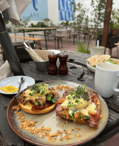 The interior is exactly what I envisage when I think of brunch spots. Rustic wooden chairs, floral wallpaper, and pink-hued dried flowers make this place feel so chic, but it has a super laid back vibe.